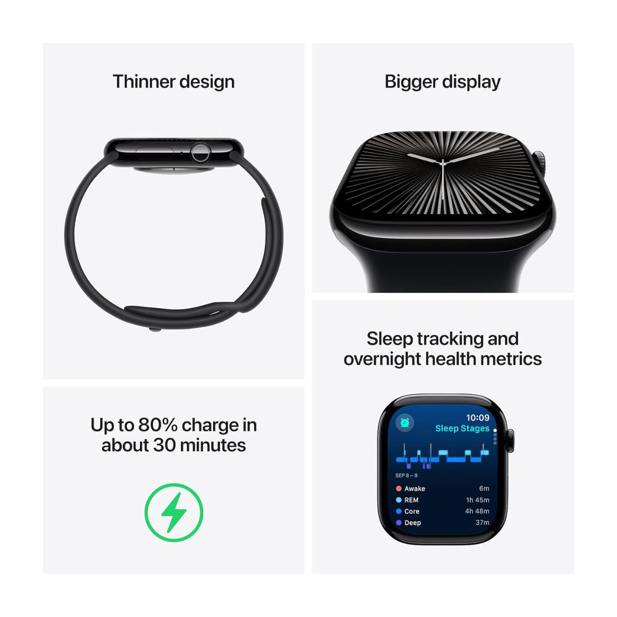 Bigger display with up to 30 per cent more screen area. A thinner, lighter and more comfortable design. Advanced health and fitness features provide invaluable insights. Safety features connect you to help when you need it. Faster charging gives you 80 per cent battery in about 30 minutes.