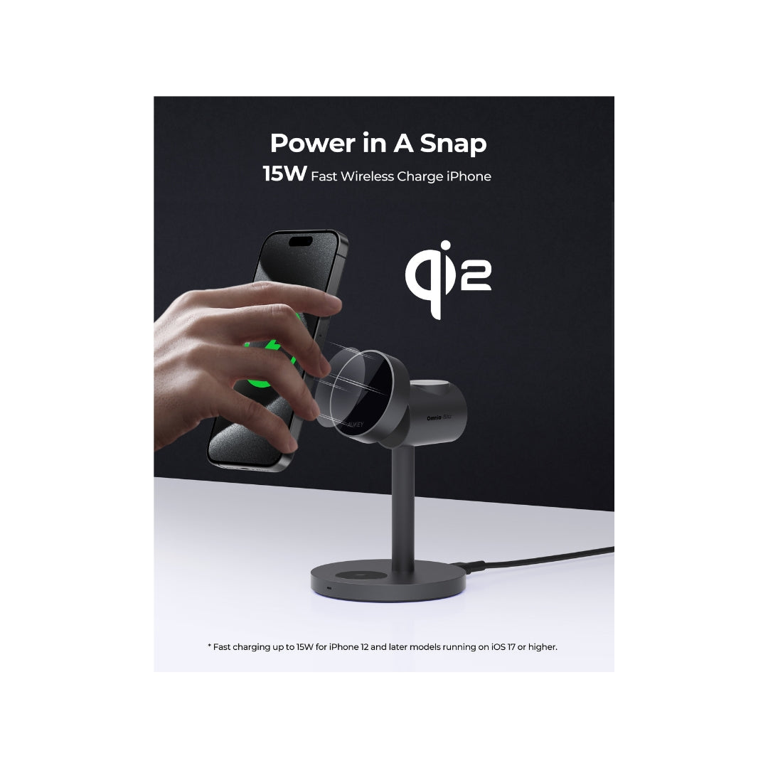Aukey 3-in-1 Qi2 charger, MagSafe compatible wireless charging station, Qi2 Wireless Charger for Apple iPhones Apple Watch AirPods with Non-Slip Base PSU Included – Grey