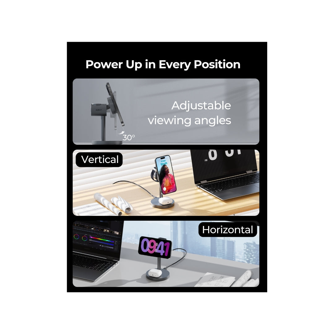 The Aukey 3-in-1 MagSafe Wireless Charger is precision-engineered for iPhone 12 and newer models, offering effortless magnetic alignment for a secure connection every time. It also supports all Qi-enabled devices, making it the ideal charger for your iPhone, AirPods, or even Android smartphones.