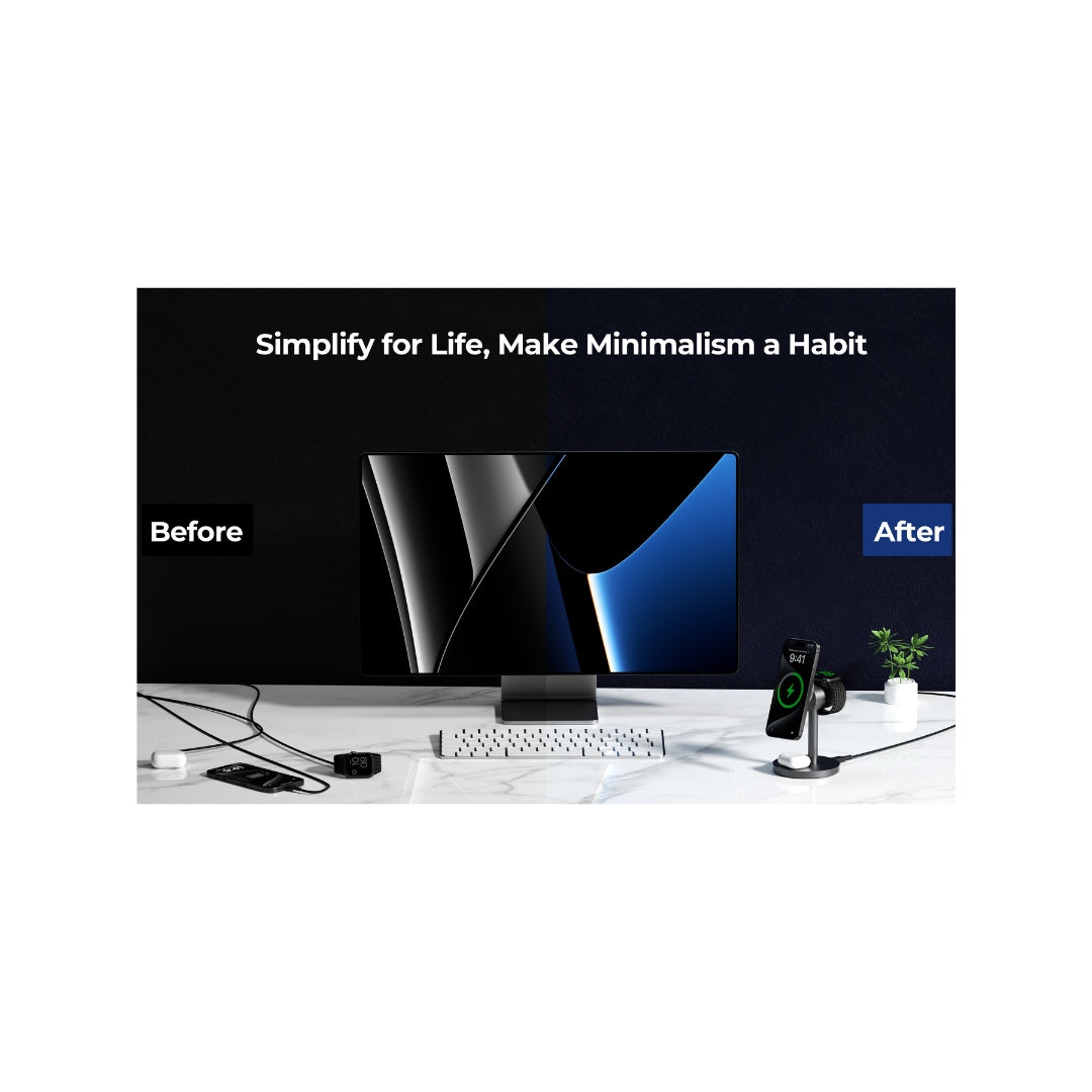 Streamline your setup and eliminate cable clutter. The MagFusion charges your iPhone, Apple Watch, and AirPods simultaneously in one compact, elegant station. Ideal for your home, office, or bedside.
