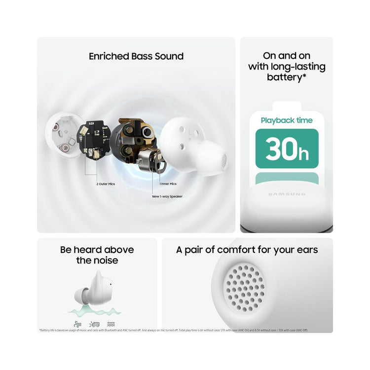 The earbuds feature a long-lasting battery, lasting up to 30 hours on a single charge, ensuring they keep up with your daily routine. Plus, with Auto Switch, your audio seamlessly follows you across Samsung Galaxy devices, whether you're switching between your phone, tablet, or TV.